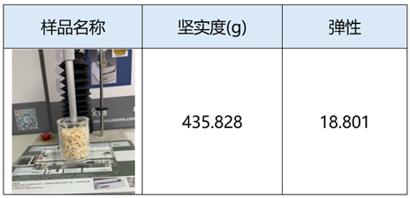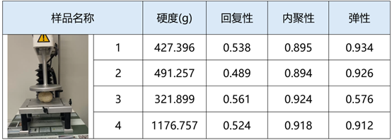n  实验采用 “换探头” 策略,实现形态专属测试。块状样品用   P/100 圆盘探头做 TPA 测试,测硬度、弹性等指标,如样品 4   硬度最高,适合追求紧实嚼劲的场景。