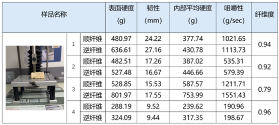n  纤维状或部分块状样品用   A/MORS 刀具探头,顺、逆纤维剪切测试表面与内部硬度及纤维度,逆纤维方向硬度普遍更高,契合 “顺纹咬更省力” 的体验。
