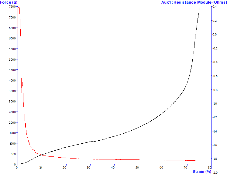 在材料受力产生应变的过程中,其内部结构发生变化,导致导电性能改变,电阻随之变化。比如,当材料受应变时,可能出现导电通路的变化(如导电粒子的接触状态改变等),从而使得电阻模量随应变呈现出这样的增长趋势,而力的变化则体现了材料在应变下的力学响应,初始的力下降可能与材料的弹性变形、内部结构的快速调整等有关,后续力趋于稳定说明材料进入某种稳定的力学状态,而电阻仍持续变化,显示出电学性能与力学应变的关联特性。 |