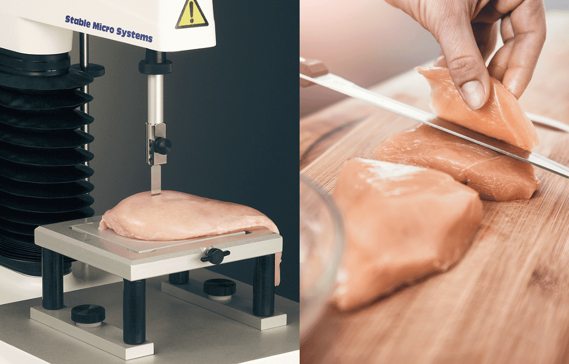 Meullenet -Owens Razor Shear 方法(源自阿肯色大學進行的研究)使用連接到質地分析儀的極其鋒利的工藝刀片進行切割/剪切測試。由於刀片很窄,只能穿透20毫米,因此MORS測試只在樣品上切開一個小切口,對樣品造成的損傷遠低於傳統的儀器或人工切割測試。可重複性也得到了優化,因為刀片可以定期拆卸和更換 - 甚至在每次測試後 - 以確保邊緣鋒利。建議每測量100次就更換鋒利的刀片,以獲得最佳的剪切性能和結果的可重複性。 對刀片的試驗表明,它每小時可以進行60次測量——是Kramer剪切試驗的兩倍。Kramer Shear裝置和Warner – Bratzler刀具都廣泛用於評估家禽嫩度,並已成為行業標準測試方法。然而,樣品尺寸會顯著影響結果——使用MORS刀具可以消除了這一影響。 |