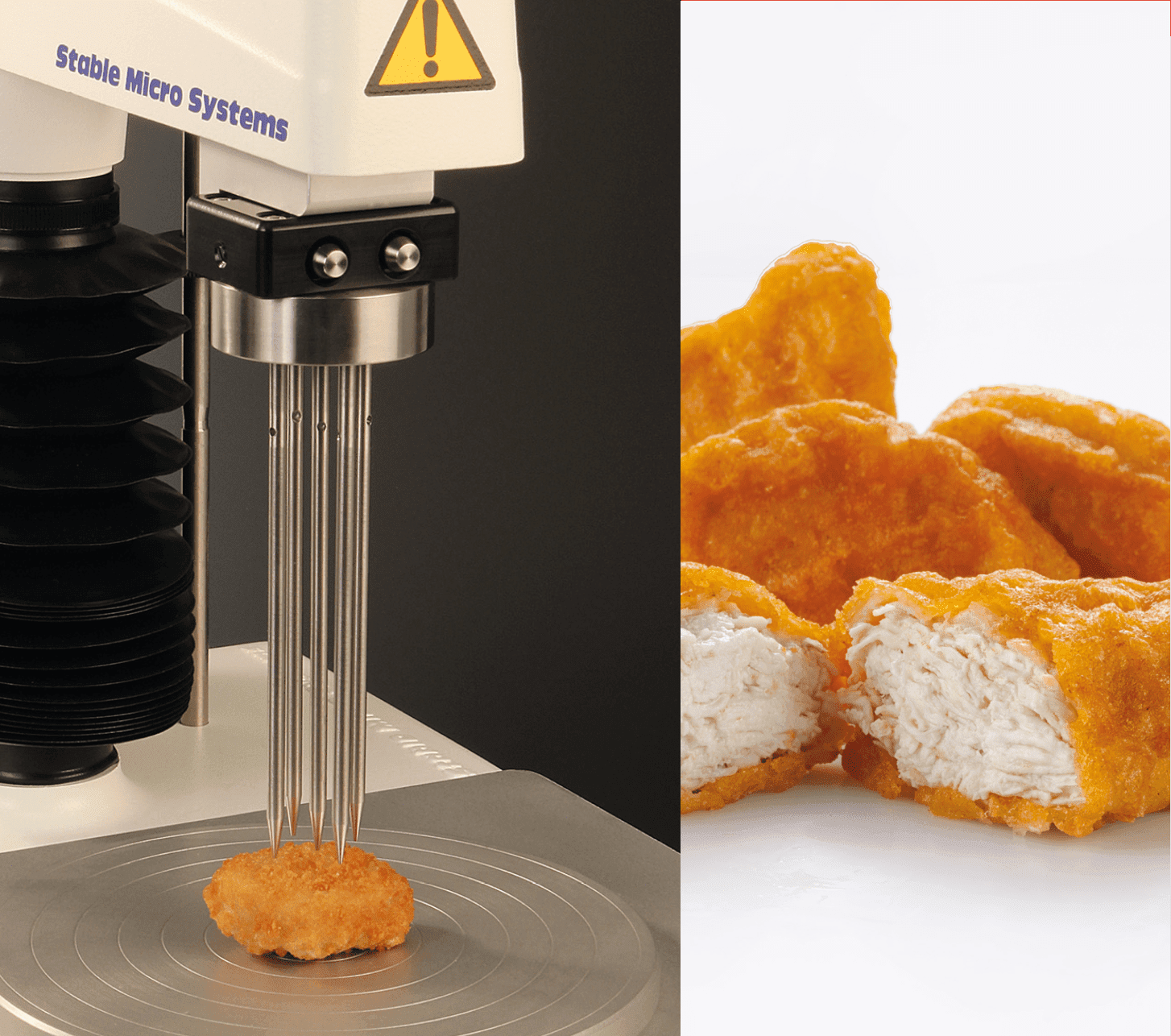 穿刺測試非常適合測量麵糊產品,因為可以通過穿刺測試刺入到塊體中來測量麵糊層的特性。非常脆的產品可以使用接觸面積較小的探針進行測試,例如 2mm穿刺探頭或A/MROS刀片,也稱為Volodkevich Bite Jaw。該夾具通過模擬上頜和下頜切入食物的咬合動作進行模擬測試,咬合動作由上頜剪切到測試樣品中的壓縮運動提供。 使用這種固定裝置的最大優點是它可以模仿口腔中發生的咬合動作。但是,有兩個限制:樣本大小限制在 1cm2,樣本需要用手指支撐,直到上顎接觸到樣本。 在許多情況下,多針穿刺是單次穿刺更好的替代品,因為它允許製造商測試包含不同尺寸形狀、顆粒結構和硬度水準不均一的產品,以提供可重複的結果,這是由於多針穿刺的平均效應。炸雞條是這種產品類型的一個很好的例子,因為雞肉的形狀和油炸層是不均勻的。可以移除外部針腳,以便穿刺探頭覆蓋所測試的樣品,所有探頭都安裝在測試中任何給定樣品的周邊內。 壓縮測試也經常用於測量麵糊脆度,特別是在測量具有柔軟、柔順核心的樣品或單獨的麵糊樣品時。當使用較大的探針接觸面積時,壓縮力會放大。 |