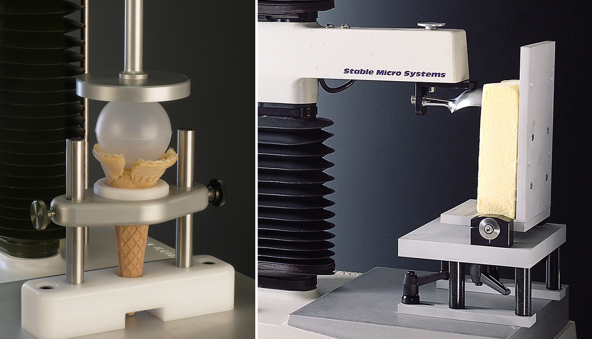 測量打開飲料或食物罐頭的力是另一個例子,其中需要測量力來評估顧客在嘗試獲取內容物時的輕鬆程度。在太容易打開(有意外打開東西的風險)和太難打開(會影響客戶忠誠度和重複購買)之間存在一種理想的力量。因此,這些力量對於測量和控制穩定的產品品質是必要的。 為了模擬將一勺霜淇淋推入甜筒的動作,我們開發了如下所示的方法,並為了測量霜淇淋的可勺性,我們使用了霜淇淋勺裝置。有時您只需要保持簡單的測量,並嘗試重新創建消費者進行主觀評估時在現實生活中執行的操作。 |