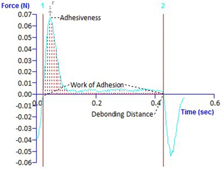 豬粘膜是通常用於生物粘附測試的膜。由於組織本身通常是不一致的,樣品製備確實需要樣品的一致採集、修剪、儲存和環境調節,以免對優化測試方法所需的實驗造成障礙。人工膜亦可簡化使用生物膜製備樣本的難度。 然而,樣品製備和測試方法技術因樣品的性質而異。以下幾點旨在提供對替代樣品製備方法、探頭選項和必要方法調整的理解,以幫助設計定制測試,特別是粘膜粘附測試。 樣品製備和測試替代方案 生物粘附測試的最常見探頭大小和尺寸是直徑為 7-10 毫米的丙烯酸或類似圓柱體。片劑和薄膜(標準截面尺寸)等固體材料通常使用氰基丙烯酸酯粘合劑或雙面膠帶附著在上部測試探頭的下側。 探頭以選定的速度接近樣品,並在選定的時間內對粘膜施加選定的力,以便在兩個表面之間形成良好的結合。在此之後,探頭從粘膜中抽出,並在這樣做時測量分離兩個表面的粘附力。 對於粉末的評估,可以通過將探頭(底部貼有膠帶)浸入粉末床中來施加粉末,然後輕輕搖動探頭以去除多餘的粉末,以獲得單層顆粒。選擇雙面膠帶時,應盡可能選擇最薄和最硬的膠帶,因為在剝離過程中不允許材料彎曲或鬆動。 通過預先將模擬胃液浸入預定時間間隔,用模擬胃膜覆蓋探頭和測試平臺並在施加 2N 的力後,測量樣品的生物粘附力(分離力),已經成功地測試了胃球樣品。 生物粘附聚合物在粘膜藥物遞送劑型配方中的應用正受到越來越多的關注。冰島大學藥學院的研究人員 Skulason、Kristmundsdottir 和 Holbrook 開發了一種評估水凝膠組合物粘附性的技術。凝膠粘膜粘附探頭的末端為倒錐形,具有機加工的同心凹槽。這些凹槽有助於將受控體積的水凝膠樣品附著到探頭表面區域。對於恒定的凝膠體積應用,建議使用注射器。提供聚四氟乙烯套環以支援更大體積的水凝膠負載,凝膠凝固時將其移除。 當粘膜保持在環境條件下而不懸浮在例如胃液中時,通常將固定體積的緩衝液吸移到粘膜上以在測試之前標準化水合作用。 可以從質地分析圖中獲得的典型屬性,以及通過使用 Exponent 軟體中的巨集快速獲得的典型屬性: |