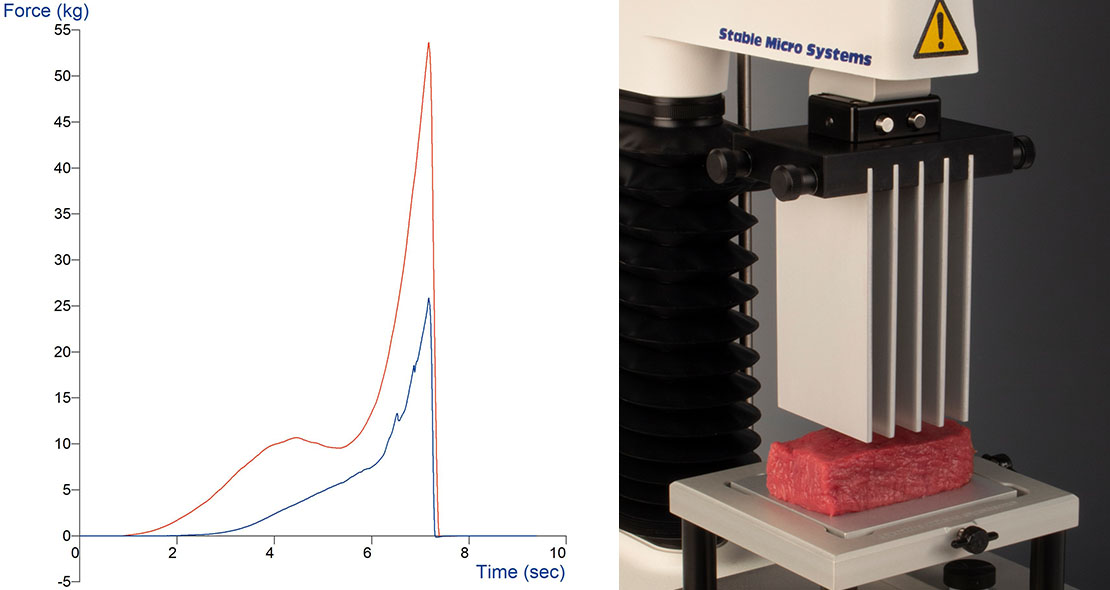 以上曲線是使用 Kramer 剪切裝置 的 5 刀片頭測試植物基魚柳和傳統魚柳,以檢查和比較剪切/切割特性。 從兩個樣品獲得的測試結果給出了以下平均值: |