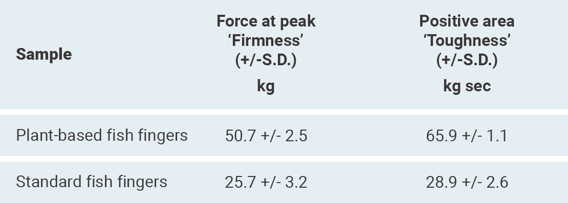 肉嫩度可以使用質構儀上的刀片切割來測量,以複製牙齒閉合和咬食物樣本時的動作。測量切割肉所需的力,較低的切割力表示肉更嫩。最大力記錄為硬度,曲線下方的面積記錄為韌性。在質構測試中使用多刀片可以減少測量誤差並提高可靠性。 基於植物基魚柳與標準魚柳的硬度和韌性測量 對消費者來說魚柳重要的質地參數是外皮的脆度和嫩度。 適當的質地可以增強魚柳的吸引力和可取性,並且可以影響對味道、多汁性和整體享受的感知。 |
