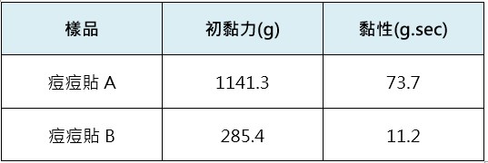 | 從測試結果可得知痘痘貼A有較強的初黏力及黏性,對於強的初黏力使得樣品容易貼附上去,而較強的黏性能與皮膚有效接觸。 |