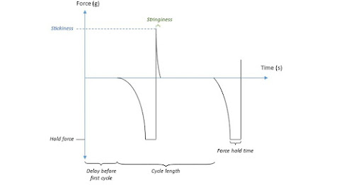 黏性是某些產品的主要考慮因素,同樣是某些產品所需的特性,但它也可能是一種不吸引人的感官特性,使消費者感到反感。然而,它是一個簡單的測量屬性,這就是使用質地分析儀的用武之地。 最近我們改良了用於測量指甲油附著力裝置的應用範圍。在測試過程中,將樣品填充到20cm長的平臺中,填充深度為0.5mm,並沿著該平臺進行5-10次附著力測試。將探頭以750g的壓力下保持在樣品表面5秒,使探頭和樣品之間形成黏合,然後快速撤回並測量黏性(分離兩個表面的力)和拉絲性(分離發生前拉開的距離/時間)。 |