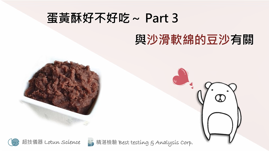 你喜歡哪種口感的豆沙? 軟綿易化口、濕潤綿滑、沙滑軟綿或具豐富的咀嚼感,目前豆沙分別有水性豆沙、油性豆沙及顆粒豆沙三種,而不同種類豆沙各有各的質地優勢,如水性豆沙含水量高口感相對濕潤柔軟,且具有沙滑的口感;油性豆沙水分含量低、塑性高加工時不黏手且保質期長;則顆粒豆沙可提升整體口感咀嚼度。 豆沙影響蛋黃酥整體的味道與口感 糖在豆沙中不僅提供甜味,還會增加豆沙粘性,保持濕潤口感;油脂可以軟化豆沙、易可提高潤滑口感並延長保質期。恰當的糖與油脂可以提升豆沙的質地及穩定性。 使用質構分析儀客觀量化三種豆沙質地 從資料可看到顆粒餡與沙餡的均質性參數差異化,兩種豆沙餡的動態硬度相近,從力值的升降趨勢顯示出水性豆沙的化口性優於油性豆沙並帶有沙感,並驗證出粘聚性的糊口指標趨勢依序為顆粒豆沙>油性豆沙>水性豆沙。 測試指標反應不同原料與配方的差異化也能顯示出不同的加工性,其中粘聚性與緻密性指標可以做為蛋黃酥製作原料的加工性與保水性參考參數。 |