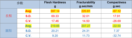 實驗方法 | 將長黎與圓梨從中心切開成兩瓣,並使用直徑2毫米柱型探頭對果肉進行穿刺,並分析果肉的穿刺曲線定義脆性。 | |
