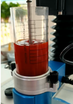 番茄醬流變:使用PFA流變裝置,取130ml番茄醬樣品,進行攪拌測試;測試前注意要進行力量校正和高度校正。
