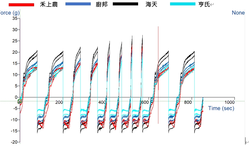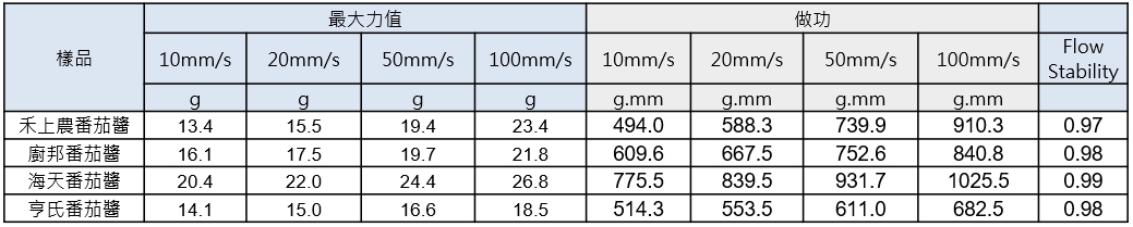 從資料來看,可以明顯看出流動性差異,亨氏流動性最好,海天最不易流動,另外在攪拌速度增加的情況下,禾上農的流動阻力變化最大,其他三種番茄醬變化率比較接近;從流動性穩定性來看,四種番茄醬都比較穩定,對比來看禾上農的流動穩定性最差,這是因為其添加比較多增稠劑,造成穩定性欠佳。