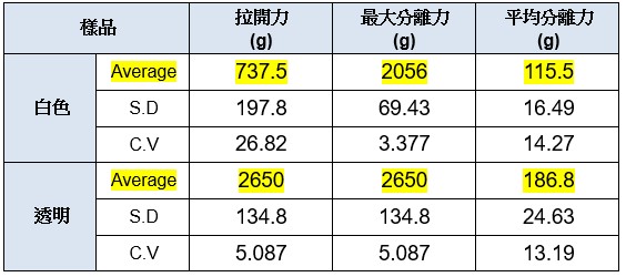 白色自封袋在夾層中帶有一節一節的卡槽設計,導致平均分離強度變高;透明自封袋在打開袋口前,有一道很明顯的"噠"聲,可以表示袋口即將被打開。