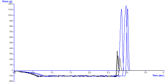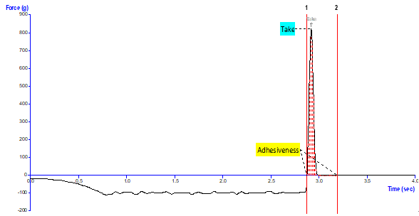 Tack初黏力:曲线上第一个正峰力值,可表示样品的初黏力,g。 Adhession 黏性:区域内的面积,表示为样品的黏着性,g.sec。 |