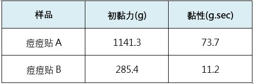 从测试结果可得知痘痘贴A有较强的初黏力及黏性,对于强的初黏力使得样品容易贴附上去,而较强的黏性能与皮肤有效接触。 |