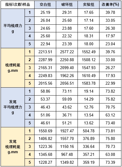 目的 | 使用SMS物性分析仪搭配头发连续梳理装置(A/HCR)对头发进行梳理,实验过程中头发连续梳理多次,评估使用样品后的改善效果。 |