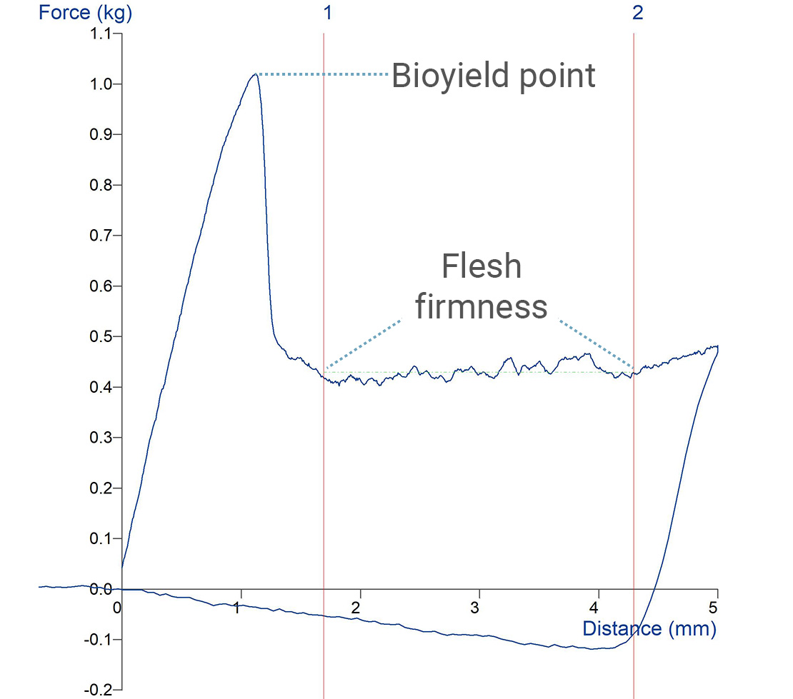 欲了解更多关于拉伸性能测试的建议,可以向我们索取文件“Tips and Tricks for Successful Tensile Testing”。 测试有外壳、酥皮或薄层的产品 薄、脆、层压或多相结构的细节收集最好使用小直径探针或薄而锋利的探头(例如工艺刀)进行。 产品内部的不同结构可以测量并在图表上识别。 |