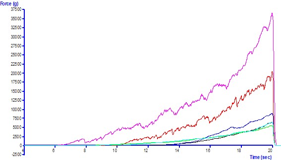 目的 玉米脆片感官评价都是从硬度和脆性入手,并且很多时候我们会倒入牛奶软化后做为早餐食用。实验评估未浸泡和浸泡一定时间的质构差异,由于膨化食品均一性比较差,因此进行批量测试,再搭配先进的声音装置进行脆性辅助分析,最终得到玉米脆片处理过后的质地变化。 实验方法 注意要称取相同重量样品,并且进行高度校正。 1.批量压缩试验:称取相同重量30g之玉米片,以浸泡常温水0、15、30秒后进行上机分析。测试方法考虑到玉米片表面不均一,且个体差异大,OTTAWA CELL (A/OTC)装置进行批量压缩。 2.声音收集装置:在批量测试中附一声音装置来收集压缩过程中分贝的变化,通过声音大小评估酥脆性的变化,并和力值数据进行比对。 |