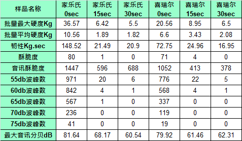 实验结论 从质地分析图形与数据解析的结果可以明显看出,两种玉米片都随着浸泡时间在硬度、韧性与酥脆性特征都越来越小。 而品牌差异部份为家乐氏其硬度与酥脆性大于喜瑞尔,不管是力值起伏的波峰数量,或是声音能量释放的音讯波峰数量都有显著的差异。软件可进一步根据声音能量大小(dB) 的数量分析,可看的出来随着浸泡后,声音能量在60dB以上快速减少。但有趣的是浸泡水后可从下表看出喜瑞尔其硬度下降较慢,反映出更为耐泡。由于本次使用常温水,但玉米片时常伴随着冰牛奶食用,故可再进一步分析其结果。 |