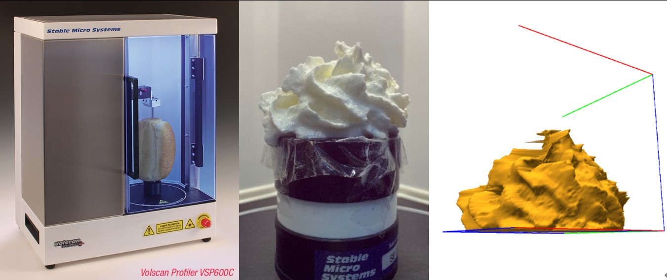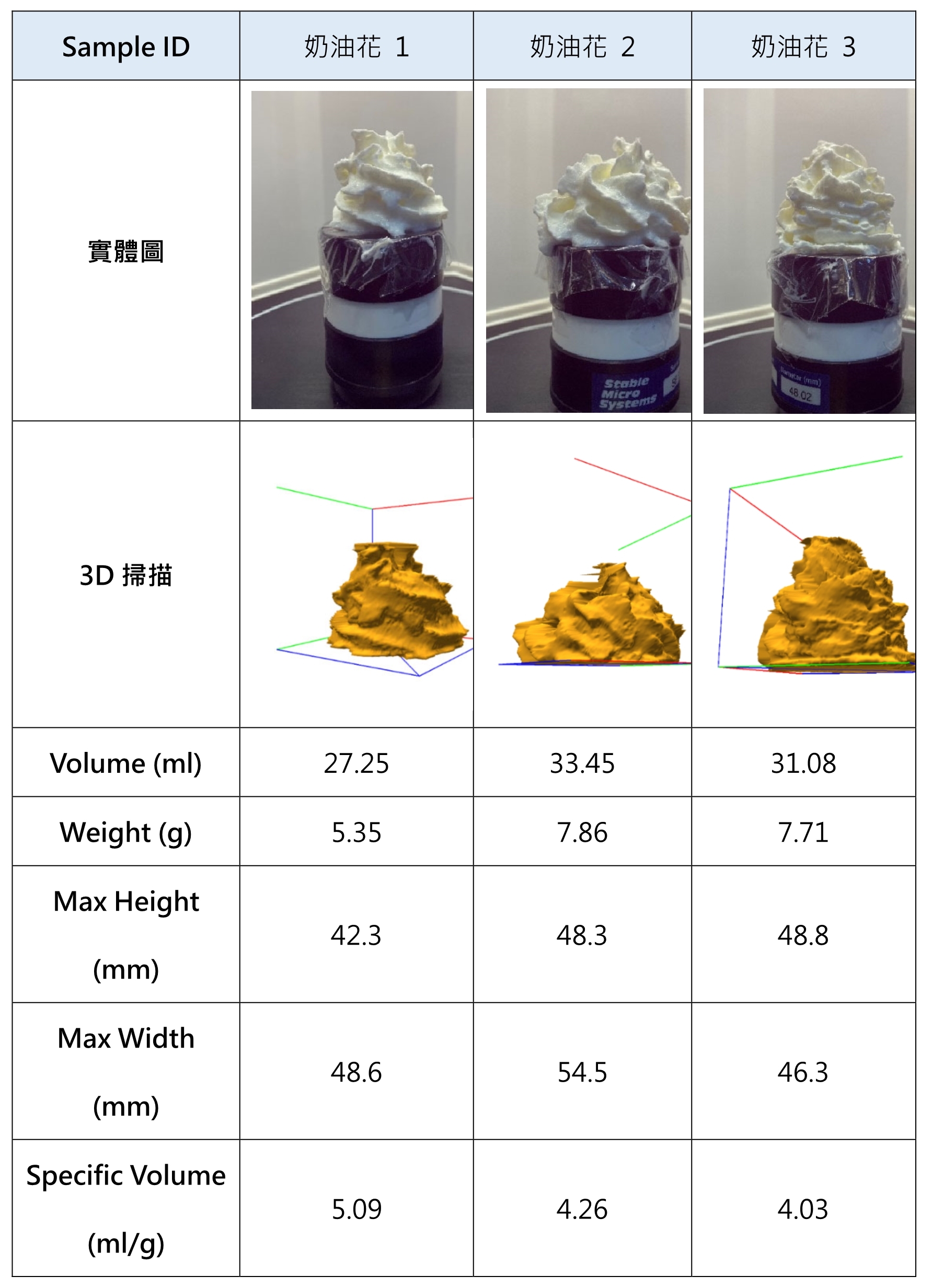 奶油可分成動物性奶油以及植物性奶油,其溫度、水乳比例、不同的打發程度將影響其成型性,藉由體積測定儀可以簡單快速測定其體積大小及比重,以利評估奶油花品質。