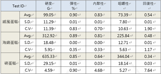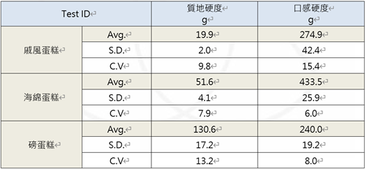 目的 | 使用不同的測試方式評估三種不同蛋糕質地的差異。 | |