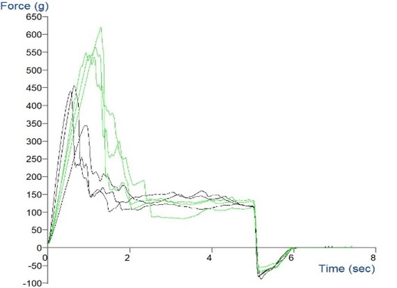 實驗結論 | 從以上的水果實驗可以看出不同的水果的差異是比較大的,造成這種差異的因素有很多,比如像獼猴桃、芒果這種果皮較軟的水果在使用探頭進行測試的時候會發現探頭不容易穿透果皮,因為果皮和果肉較軟在穿破的時候探頭就會陷下去許多,導致刺破果皮的最大力度就會很大,且隨著時間的增長這種破皮力會變的更大,但是像蘋果、梨這種果皮果實較堅硬的水果會發現破皮力就小得多。 在測試趨勢圖中我們可以看出在剪切實驗中大多數水果的逆纖維使用的力要比順纖維大的較多,這個結果原因是因為我們在逆向切割時會受到組織纖維的阻礙,而順纖維切割時候這個阻力就會小許多,因此順纖維切割要比逆纖維更省力。 | ||