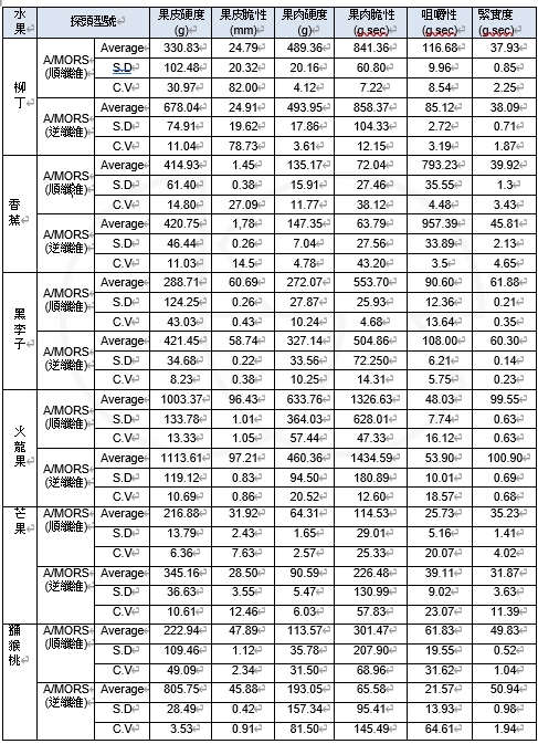 目的 | 1. 評估順纖維和逆纖維測試出的資料差異。 2. 比較不同水果順纖維和逆纖維的資料差異。 | ||