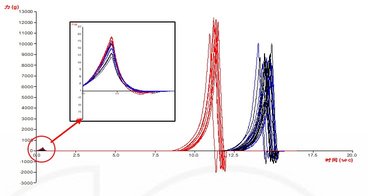 使用質構儀搭配P/36R平底測試探頭進行測試。量取100g大米,淘洗兩次後瀝幹水分,加入1.2倍水後進行煮飯,待煮好悶半小時後取鍋體中心中層米飯,放置在培養皿中(加蓋),涼45分鐘至室溫後上機測試,每次取3粒米放置在探頭下方,使用TDT(兩次變形壓縮)測試方法,得到其硬度、粘性、回復性和口感均衡性。 |