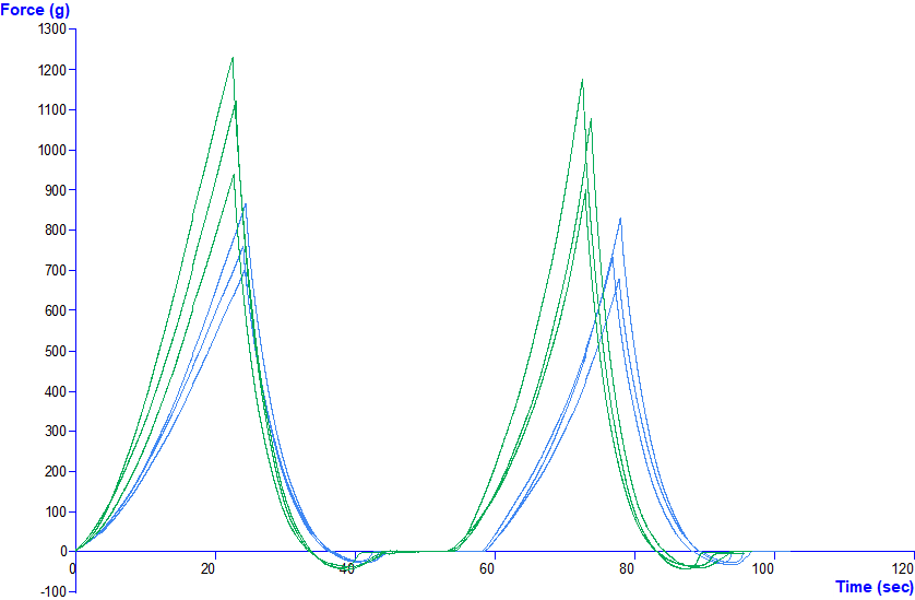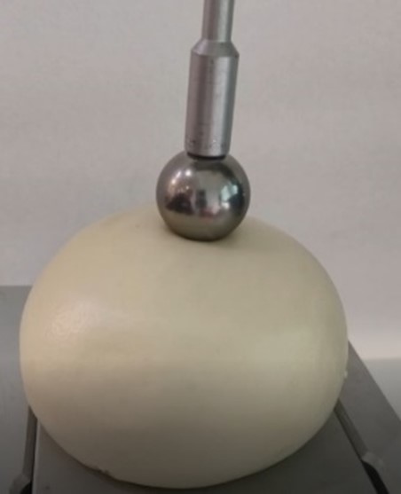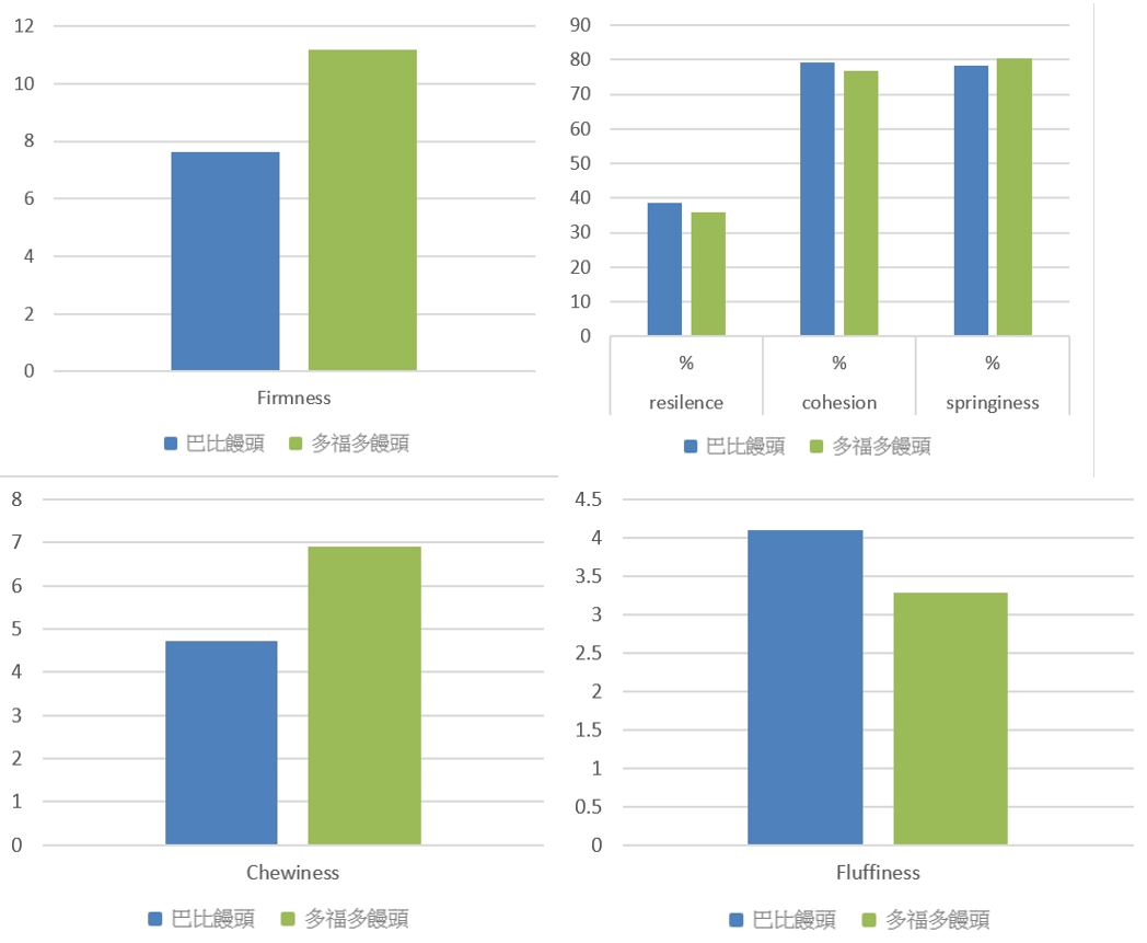 使用全質構分析(TPA)得到硬度、回復性、內聚、咀嚼性以及蓬鬆度(Fluffiness)。