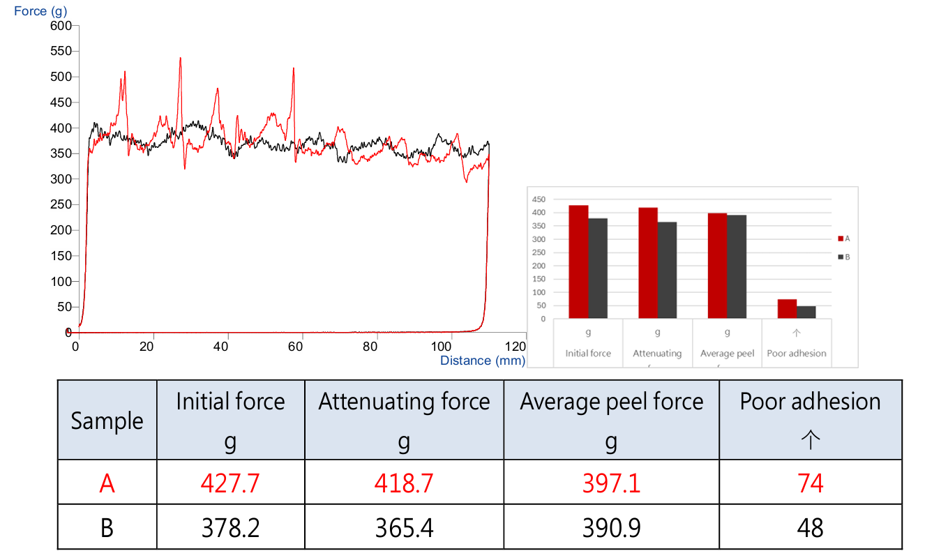 通过测试可以看到虽然样品A、B平均剥离力相近,但两者特性却大不相同—— |