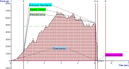 Flexibility 脆性:曲線上剪切1.5mm至10mm間10g以上的波峰個數,值越多表示樣品越脆。 Taste level口感層次:曲線上剪切1.5mm至10mm間10g以上的線性距離,值越大表示樣品層次越豐富,mm。 Average Hardness平均硬度:曲線上剪切1.5mm至10mm間10g以上的平均力值,值越大表示樣品內部構造越堅實,g。 Chewiness 咀嚼性:曲線上的正峰面積值,反應樣品剪切的總功,g.sec。 Adhesiveness 粘性:曲線上的負峰面積值,g.sec。 | |