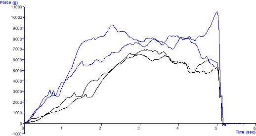 實驗方法 | 因樣品由多成分穀物所組成,其幾何形狀及內部結構很不均一,因此本實驗通過寬25mm刀型探頭(A/CKB)對此樣品進行剪切測試,進而得到與口感相關聯的測試指標。 |