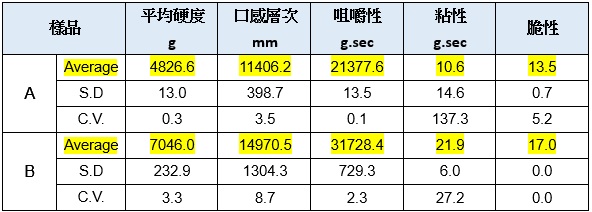 實驗結論 | 以此次實驗可明顯觀察到樣品B不論是硬度、咀嚼性、脆性都較樣品A來得大,且樣品B的口感也相較樣品A來的豐富。此次測試結果與口感相符,但因樣品數量不多無法多重複進行分析,建議後續多增加檢測重現性,且樣品幾何形狀製備大小一致,得到與口感關聯更佳的資料。 |