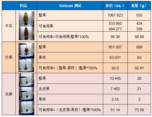 体积测定仪除了应用在烘焙产品外,在水果上的应用也是一个常见的项目,其中水果的可食用率就是一项重要的指标。传统的测试方法是用重量比来表示,即可以食用部分的重量与整颗水果的重量之比值,而Volscan体积测定仪不仅可以测量重量比,还可以通过体积测定来反映出水果的可食用率指标。