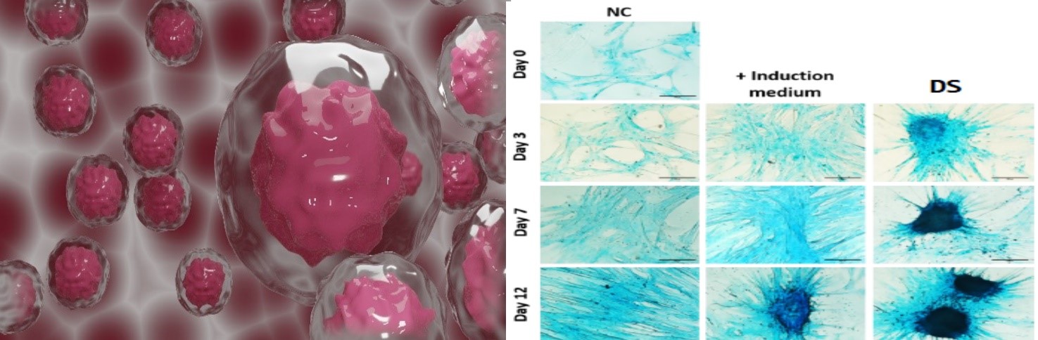 想象一个癌症病患,在接受化疗前病患已经先行自取自体干细胞为未来医疗做准备,当接受化学或标靶药物等治疗后,这时的植入个体非常虚弱,如病患此时选择接受干细胞疗法治疗,那干细胞如何在此同时担任救援投手与扮演好该扮演的角色是需要被研究讨论的。 在个体最虚弱的时刻,干细胞如何提前适应身体内的张力?如何提高其的存活率?干细胞是否能表现其功能,等上场时马上发挥最及时治疗? 研究显示用犬类脂肪干细胞(ADSC)来研究诱导分化成软骨细胞的实验,一组实验是加入(+Induction Medium)用化学剂诱导方式来诱导干细胞向软骨细胞分化,并用染软骨分化的特定染剂(Alcian Blue Staining)来染色,发现如上图(中排)细胞会于第12天有聚集的特性;如图(右排)实验室仅藉由周期性拉伸(CS)物理性刺激没有加化学诱导(Induction Medium),结果发现细胞会在第3天即开始聚集,到第12天已充分聚集并诱导分化。 其研究更进一步指出机械动态拉伸力刺激影响,让脂肪干细胞分化成各类组织的潜在能力,在转译医学更具备应用于临床治疗疾病的发展。更多研究也发现藉由机械动态拉伸,会改变干细胞分泌的Exosome(外吐小体)其内部所包含的组成;Exsome除了是帮助疾病诊断的生物标记或传递的载体之外,有些研究团队更好奇想知道用机械动态拉伸之后,干细胞所分泌的Exsome是否具有疾病治疗上的可能性。除此之外,藉由机械动态拉伸模拟软骨老化相关疾病(例如退化性关节或骨质疏松症),提供新的药物筛选或治疗平台,或是模拟适度运动,探讨预防性减缓老年人骨质疏松症恶化进程的可能性。 这些有趣的实验告诉我们植入个体前先让干细胞接受机械力刺激,如参加健身运动般让干细胞提前接受物理性机械力刺激来适应身体内的张力与先行驯养,驯养的方式是藉由物理性刺激相信比用化学诱导更安全,让干细胞植入个体前做好最周全准备以利追求植入个体后提高其存活率与加速缩短其复原时间做努力。