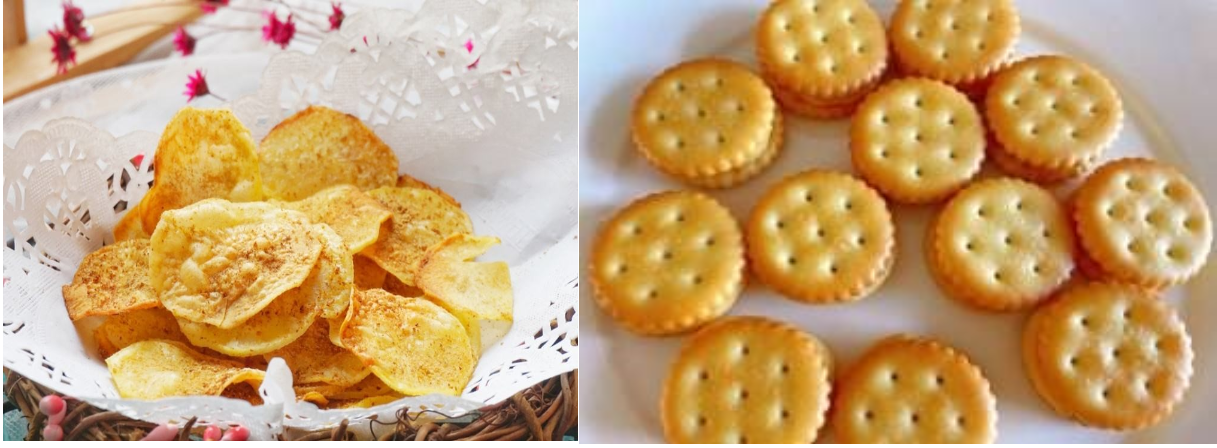 干脆食品(烤面包、薄脆饼干、干零食等)的结构与湿脆食品大不相同。然而,它们在被咬时发出的声音与湿脆食物发出的声音具有相同的时间放大特性。干脆食品产生声音的机理也可以用细胞模型来解释。在干脆食品中,细胞或腔体通常充满空气,并被硬而脆的基质包围。外力作用在这些脆弱的细胞壁上,导致细胞壁轻微弯曲,然后断裂。破碎后,剩余的细胞壁和产生的任何碎片都恢复到原来的形状。这种回跳和随后的振动产生声压波。 在干脆食品中,特别是在同一产品的不同处理中,细胞壁破裂的振动速度是影响响度的最重要因素。振动速度又取决于振动碎片的刚性。硬材料比软材料振动来得快。柔软的材料振动慢。大多数干脆食品在吸收水分的同时会降低其脆性和松脆度,因为水分含量越高,细胞壁越不坚硬。而细胞模型的脆性并不能解释所有的脆性声音。 它只是部分地解释了薯片发出的脆声。当土豆片被咬碎时,声音是由薄片的反复破碎产生的。