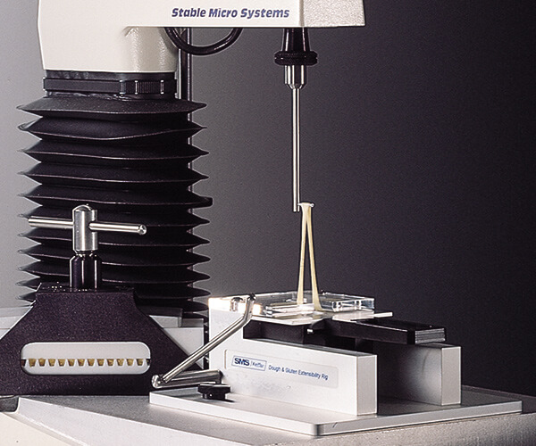 在较小的样本规模下,Kieffer Dough and Gluten Extensibility Rig为准确测定面团和面筋延伸率提供了一种有效的方法,只需要小样本(大约10克面粉或1-2克面筋),这是小麦育种家特别感兴趣的,他们需要在杂交种开发的早期阶段提供流变学品质方面的信息。 面团和面筋的平行测试可以揭示出均质性、较长的弛豫时间或添加氧化剂、盐、乳化剂或酶所产生的特殊特征,使用此装备测量最大力(抗拉伸性)和断裂距离(可扩展性)。 |