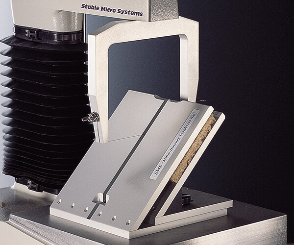 测量面包硬度的另一个选择是SMS/Miller-Hoseney Toughness Rig,这是与Kansas State University的Hoseney教授和Miller博士共同开发的,用于测定面包和其他切片产品的韧性和硬度,该试验台包括两个可调的倾斜底板(固定在质构仪上)和一个支撑架,支撑架上有一根不锈钢切割丝,该钢丝直接连接到称重传感器,测量切过样品的力,这提供了一个非常接近模仿客户在切片面包时所执行的程序测试。 |