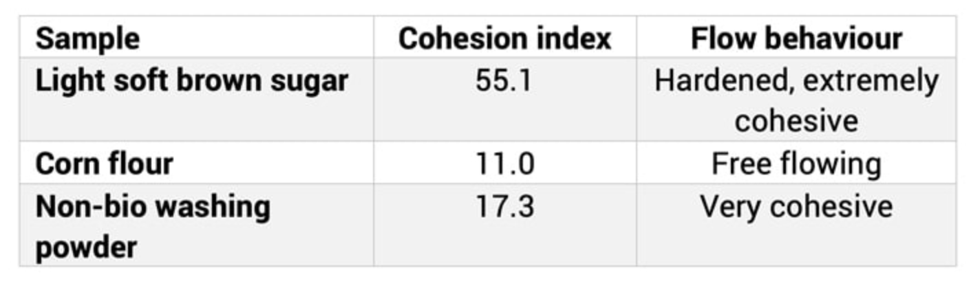 马来西亚Putra大学的科学家一直在研究利用结块强度通过泡沫垫干燥法来生产香蕉粉。 土耳其Erciyes 大学的科学家一直在研究咖啡粉的结块和粘结行为,通过对流动性和生物活性的主成分分析,研究烘焙和粒度对咖啡粉结块和粘结行为的影响。 Cohesion 内聚性是粉末颗粒粘附在一起并团聚(形成更大的颗粒簇)的趋势。粉末流动分析仪通过移动刀片以提升粉末的方式来测量这种内聚特性。粘性更强的粉末会粘附在自身和刀片上,从而减少施加在容器底部的力。这在绘制的数据中以较大的负作用力显示。 这种快速分析允许对大块固体的内聚性进行可重复的量化。测试结果可用于将被测样品与之前分析过的产品进行比较,以评估它是否更具凝聚力或更自由流动。确定内聚指標表征产品从非常有凝聚性到自由流动的流动行为。 |