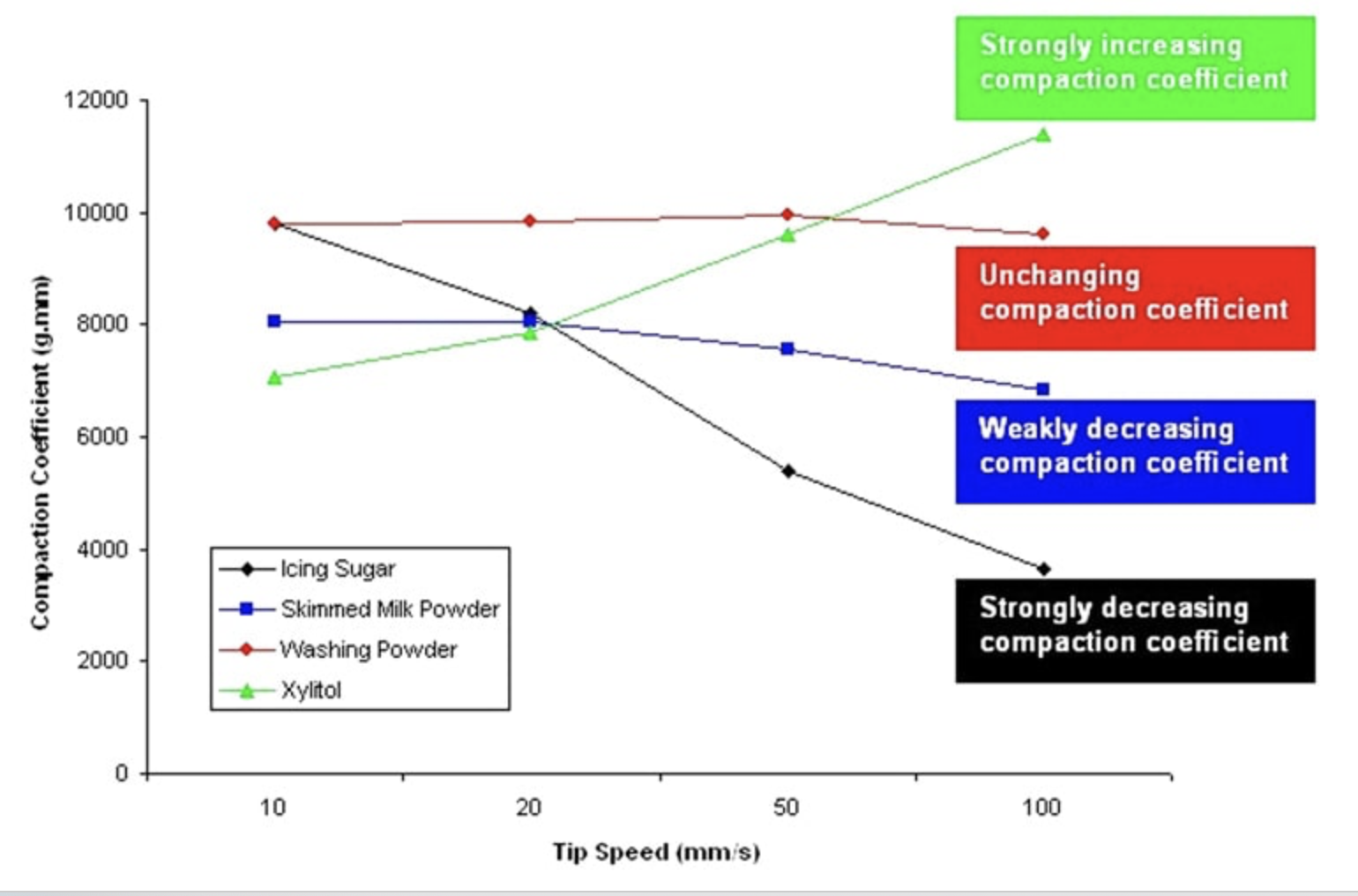 Erciyes 大学的研究人员还一直在研究蔗糖还原和淀粉类型对即食粉末甜点的体积和粉末特性的影响。 Zagreb大学的科学家们一直在研究泡沫垫干燥过程的优化,以生产富含薄荷提取物的可可粉。 PFSD 粉末流动特性可能随着流速的增加或降低而改变。例如,粉末可能会因为被迫流动得更快而变得更难流动,或者随着流速的增加它可能变得更加自由流动。由于工艺变更以满足增加的产量需求,这个问题可能导致填充不足。粉体流动分析仪通过评估刀片在粉末中以增加的速度移动所需的功来测量该特性。 粉末流动稳定性的评估是通过比较在测试开始时将刀片移动通过粉末所需的功(压实系数)与在测试结束时以相同速度移动粉末所需的功进行比较。自由流动的粉末将通过粉末柱向下或向上传递很小的阻力。相反,流动性差的粉末在任一方向上都表现出相当大的力。 |