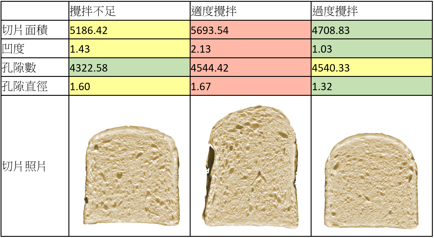 實驗結論 | 我們可以看到攪拌不足的麵包,雖然已有基本結構但成型不足,因此孔隙分佈平均但整體面積較小;適度攪拌的麵包發展良好,但由於未加蓋導致頂部過重,脫模切片後產生側面凹陷;過度攪拌的麵包麵筋結構被破壞,發酵氣體無法被保存而使麵包結構發展不起來,因此面積最小且整體孔隙偏小。 |