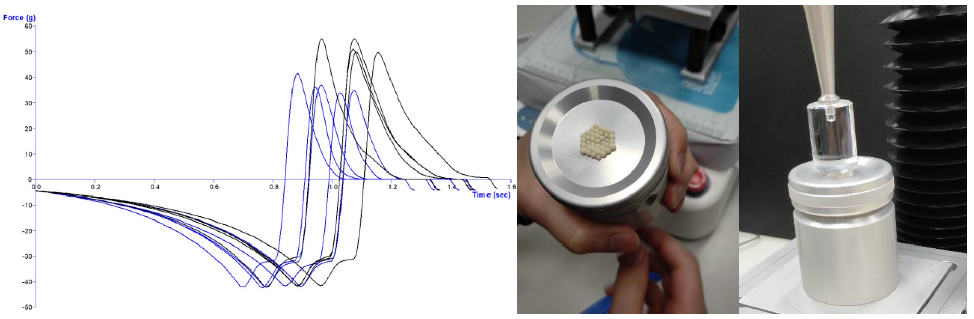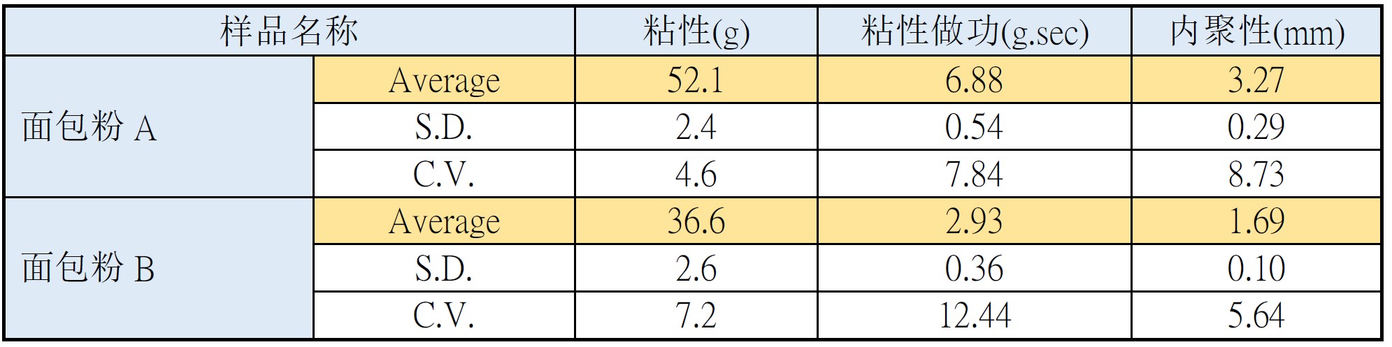 如何有效评估面团的黏性? 面粉的属性将影响面团的风味、口感及流变特性,通常蛋白质含量越高,与水混合形成的面筋(Gluten,或称麸质)其黏性、韧性和延展性也较大,口感通常会较有嚼劲,而要做出色香味及口感都满分的食品,除了靠感官评价外,更需要靠检测仪器来标准化定量。 过去我们时常使用全质构分析(TPA)的方式来检测黏性,但随着接触空气的时间不同,面团黏性将快速的变化,导致测试结果不尽理想,本次将介绍由堪萨斯州立大学Carl Hoseney教授和Chenweizhi Chen博士发表面团黏性装置(Dough Stickiness Rig,A / DSC),此装置对面团黏性测试有更加的耐用性、操作直观简单以及容易清洁。接着我们将比较市面上面包机专用面包粉,加入相同比例的盐、奶油、酵母粉及水放入面包机内,于80分钟后制作成面团,取出一小块面团放入黏性装置后,转动装置下方旋钮,先去除掉表层接触空气的部份使用压克力柱形探头进行测试,看是否能有不同趋势以及更好的重现性? 从图形及数据来看,黏性(Stickiness)、黏性做功(Work of Adhesion)都是面包粉A > 面包粉B,而内聚性(Cohesiveness)则是数值越大表示内聚性越差,故为面包粉B > 面包粉A,平行性也相较过去方案效果更佳。 |