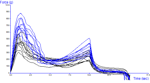 实验方法 | 进行土司切片时须表面需要尽量切平,且厚度需尽量一致(为25mm)。 1.压缩试验:使用直径1英吋聚甲醛圆柱型探头(P/1R)对厚度为25mm的土司压缩至离平台7.5mm后再返回至离平台15mm处等待10秒,透过吐司回弹时的力来评估其弹性,且参考AACCI国际标准方法取25%时的力作为吐司的硬度。 2.拉伸试验:使用拉伸夹具(A/ATG)模拟手撕开土司时的动作,以评估其筋性特性。 3.使用体积测定仪评估其整体特性 | |