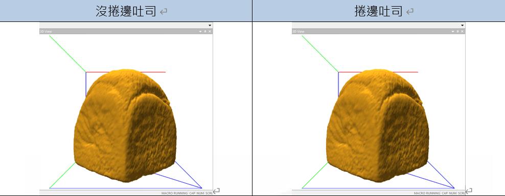 实验结论 | 在切片测试中未擀捲过的吐司数值皆低于擀捲的吐司,经过擀捲的吐司其硬度及弹性会变大。结合体积测定仪我们可以看到,同样大小的吐司经过擀捲后其体积会变小,而重量以及密度会随之变大。由此我们可以得知吐司经过擀捲后因其体检变小内部密度变大,使其硬度及弹性随之变大,从而增加了吐司的口感。 | |