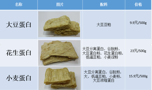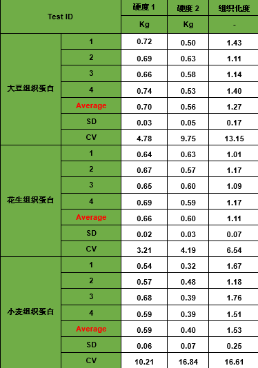 实验结论 | 因为配方的不同,所以样品最终的形态有很大的差异,主要就是高度差异,我们从数据就可以看到,另外添加了小麦粉的产品纤维组织更好,口感也会表现更劲道,但是高度确比大豆蛋白低。花生的组织化度最低,样品高度也最低。这是和花生蛋白粉的特性有关,添加花生蛋白能降低面筋的筋力。 |