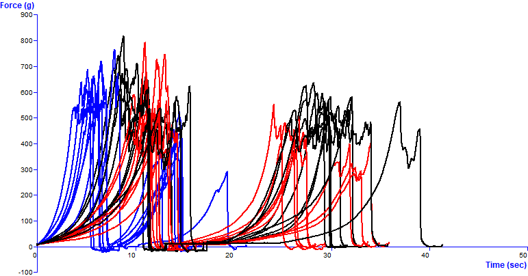 实验方法 | 1. 样品制备:先给样品赋水2h(要确认样品没有硬芯即可),然后用吸水纸包裹样品,用仪器压缩,使用10kg的力压缩1分钟左右,去除其流动水。 2. 使用A/MORS刀片,根据软件提示,先顺着纤维切再逆着纤维切。 3. 为了保证切断纤维,测试模式为应变,剪切90%的应变。 4. 注意:实验前做高度校正,探头从同一高度开始。 |