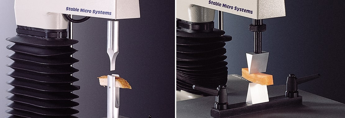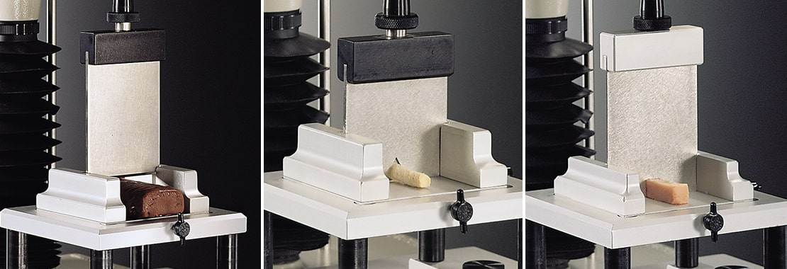 钳口测试装置 (HDP/VB) 这种固定装置是为了模仿门牙咬断食物的动作而开发的。然而,由于其尺寸限制了1cm²的样品横截面,它的受欢迎程度已经下降,除非上部的 "牙齿 "夹具被单独使用。 楔形切刀 (A/WEG) 楔形切刀提供了一种方法来评估从样品的顶部和底部通过上下楔子进行切割,每个楔子的切割角度为30°,宽度为30mm。但是,最大的样品宽度被限制在30mm。 |