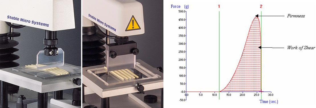 Kramer 剪切室(HDP/KS5/10)和迷你Ottawa-Kramer 剪切室(HDP/MK05) 不同形状和尺寸的产品所呈现的样品在配置上可能是不同的。当用刀片组单独测试时,测试的可重复方向可能很困难。 Kramer剪切室或迷你Ottawa-Kramer剪切室为测试不均匀的样品或具有可变几何形状的样品提供最合适的设备。若干块或重量的样品被 "批量 "剪切,其结果是剪切样品所需力量的平均值。曲线下的面积通常被计算出来,并被称为 "剪切功"--较大的数值表明样品更坚固或更有韧性。 迷你Kramer剪切室是测试小块样品的理想选择,可以减少测试所需的样品量。测试过程中产生的力较小,而Kramer剪切室在测试力超过50kg时,可能需要使用TA.HD plus质构仪。 |
