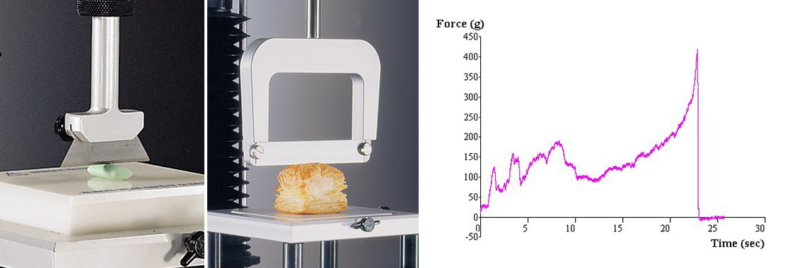 工艺刀 (A/CKB) 由于刀片的锋利,可以切割坚硬的产品,同时如果担心刀片变钝,可以提供 "一次性 "刀片的选择。刀片的厚度可以精确切割非常小的样品,例如种子或坚果,或者在不压缩的情况下剪切非常软或脆的样品,例如层压糕点。然而,由于其尺寸有限,只能测试宽度不超过50mm的样品,而且切割深度也有限。 图中显示了许多波峰和波谷(如图所示),反映了对糕点层(薄片)组的剪切或断裂,否则使用标准刀片组就会无法测出。 加长型工艺刀(A/ECB) 这种刀片是由于标准工艺刀的普及而推出的,而且必须使用一次性薄工艺刀来切割比以前能容纳的更深更宽的样品。可以测试宽度达100毫米的样品。 |