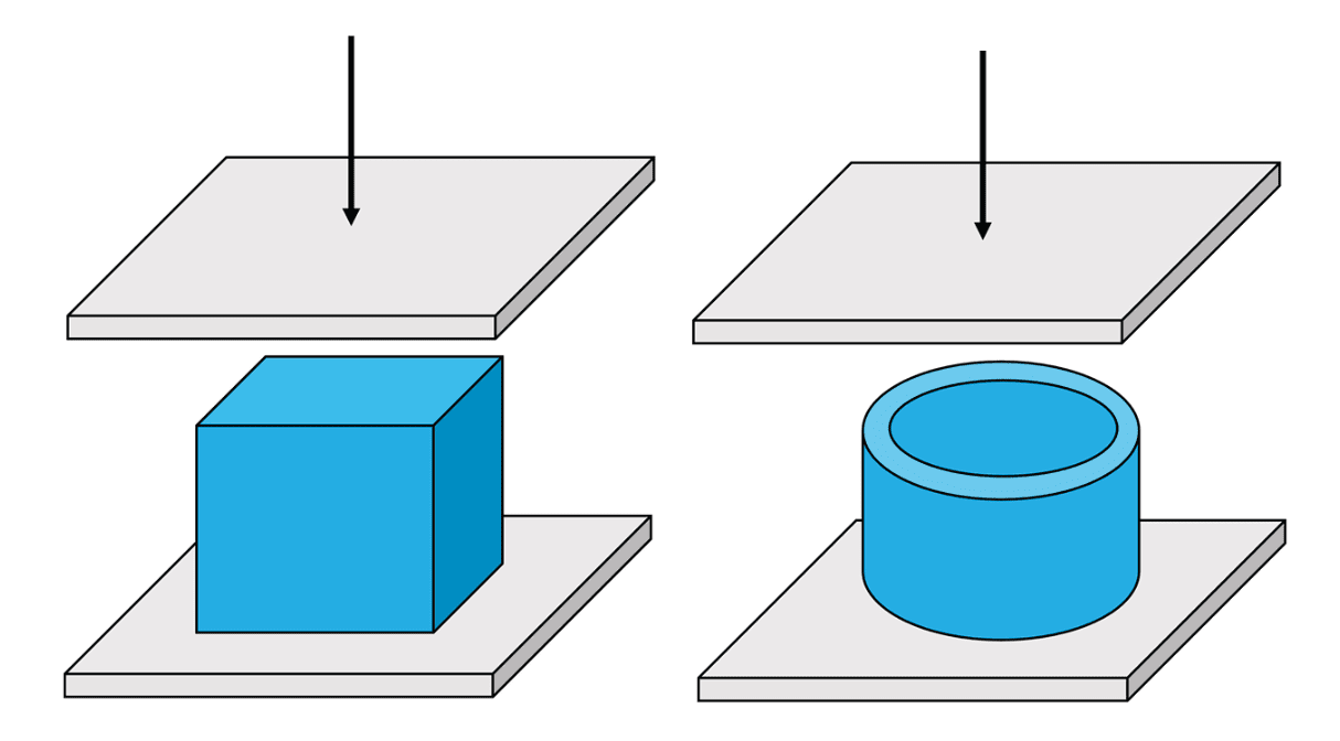 压缩 标准方法示例:ASTM D695、ISO 604。 压缩测试可用于评估材料在单轴压缩载荷下的行为。这可用于计算基本材料特性,前提是使用适当几何形状的样本(例如实心圆形或矩形截面的柱体,或一段管子)。这种类型的测试对于测量自然用于压缩的材料特别有用,例如建筑行业中使用的材料(聚合物混凝土或泡沫)。这种类型的测试对于评估非基本特性也非常有用,因为简单的压碎力测量是有帮助的。 压缩测试通常用于较硬的自支撑样品,例如用于注塑成型的热塑性聚合物或热固性聚合物。 |