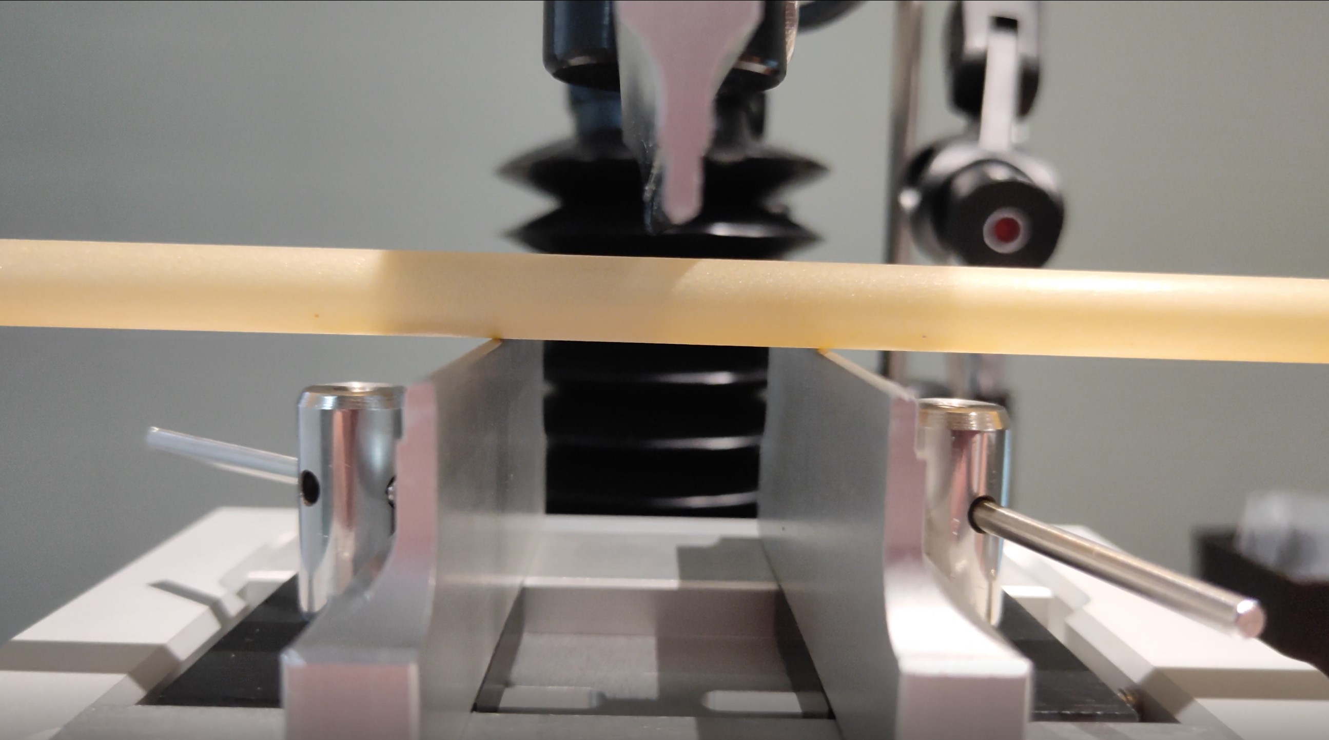 實驗方法 | 使用三點彎曲裝置與直徑36mm柱型探頭,測試吸管的彎曲剛性,壓縮強度、脆性與彈性等指標。 | |